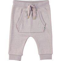 Purple baby sweatpants with glitter, a pouch pockets on the front and ties at the waist.