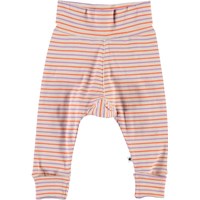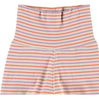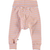 Sara is a pair of purple, orange and rose striped baby trousers in rib. They have a wide waist that can be folded for a good fit. They aslo have roll up at the legs.