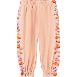 Pants for the little ones made of organic cotton jersey. The pants are pink and have a print of flowers along the legs. The pants have elastic around the waist and ankles that creates a nice little ruffle.