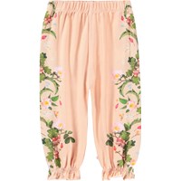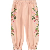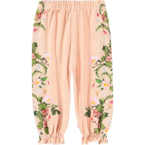 Pants for the little ones made of organic cotton jersey. The pants are pink and have a print of branches and flowers along the legs. The pants have elastic around the waist and ankles that creates a nice little ruffle.
