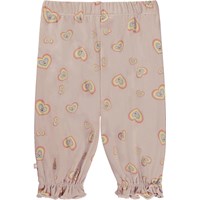 Pink baby trousers in a smiling heart print. They have elastic at the waist and legs with a gathered effect
