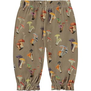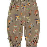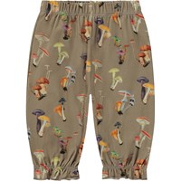 Beige baby trousers with mushroom print. They have elastic at the waist and legs with a gathered effect.