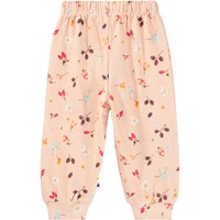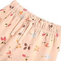 Soft pants for the little ones made of organic cotton. The pants are pink with a print of nuts, flowers and berries. The pants have elastic and a drawstring around the waist and ribbed cuffs around the legs. They are easy to take off and put on and provide plenty of freedom to move.