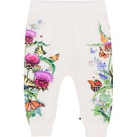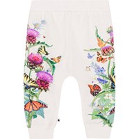 Off-white jersey trousers for small children in organic cotton. They have rib at the waist and legs and are perfect to move around in. The sides of the legs have a print of purple and red artichoke flowers with colourful butterflies.