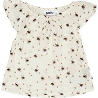 Off-white, summer top for small kids in soft, organic cotton. The top is sleeveless, has a ruffle collar and in a loose fit. It has an elastic neck that makes it easy to pull on. The top is in a sweet, all over print of small flowers with bumblebees that are flying around them. You can wear the top with the matching bloomers for a sweet summer set.