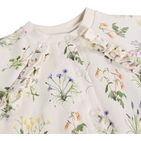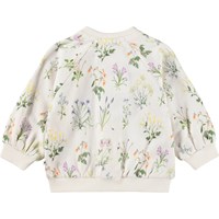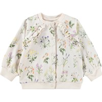 Soft white cardigan for the little ones made of organic cotton with a floral print. The cardigan has ribbed edges, fine ruffle details, and snap buttons on the front.