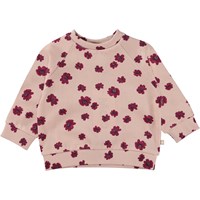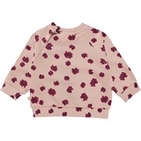 Pink baby sweatshirt with a small flower print. It has raglan sleeves and a snap closure on the back.