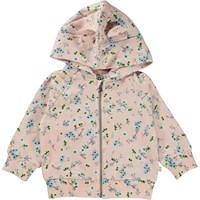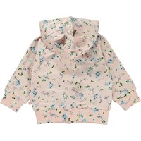 Dorothy is a pink baby hoodie, with a zip closure, in 100% organic cotton. Dorothy has raglan sleeves and a rib edge at the sleeves and bottom. The hoodie is in an all over print of small blue and white flowers. The hood has sewn on ears.