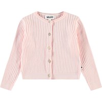 Pink knitted cardigan in organic cotton for the little ones. The cardigan is in a ribbed knit with ribbed edges at the sleeves, neck, and bottom of the cardigan. It fastens at the front with small mother-of-pearl buttons.