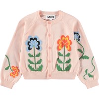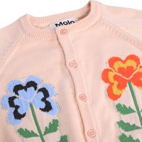 Pink knitted cardigan for the little ones made of soft, organic cotton. It has a decorative floral motif and buttons at the front.