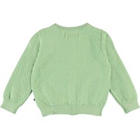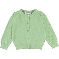 Ginny is a long sleeve, knit baby cardigan in light green. It has a lovely needle-out pattern. Ginny has mother of pearl coloured buttons down the front and rib at the neck, sleeves and bottom.