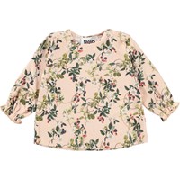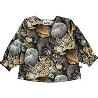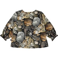 Elina is a baby top with a print of various animals that are hibernating. The top has sweet sleeves with elastic, and it has a button closure at the collar.