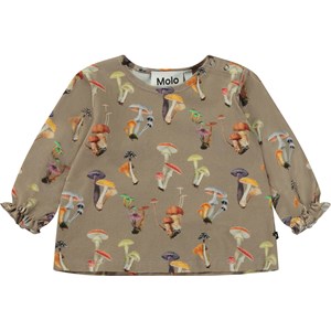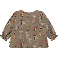 Beige baby top with a print of various mushrooms. The top has sweet sleeves with elastic at the wrists and a snap closure on the shoulder.