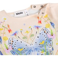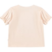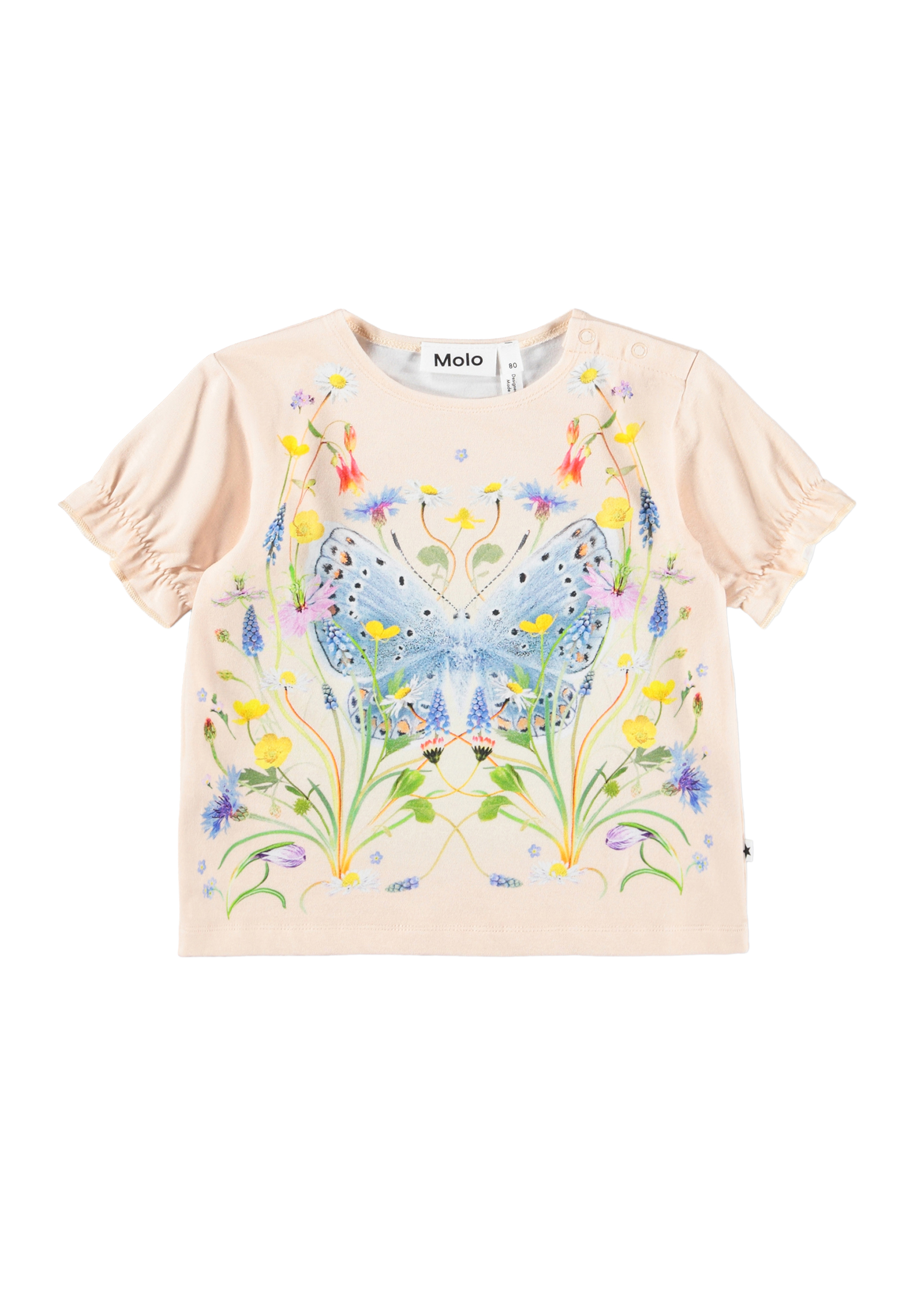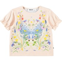 Pink T-shirt with butterfly print for the little ones, made of soft organic cotton jersey. It has a loose fit, short sleeves with elastic edge, and a nice ruffle effect. The snap buttons on the shoulder makes it easy to put on and take off.