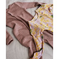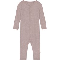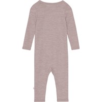 Rose coloured baby romper in 100% Merino wool. It has long sleeves and legs and has snaps down the front.