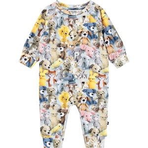 Baby romper made of soft organic cotton with a print of crocheted animals. The baby romper has long sleeves and legs and snap buttons on one shoulder and between the legs to make it easy to put on and take off. It is loose and has ribbed edges on the sleeves and legs to make it comfortable to wear and providing plenty of space to move.