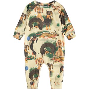 Brown baby romper made of soft organic cotton with a print of dachshunds. The baby romper has long sleeves and legs and snap buttons on one shoulder and between the legs to make it easy to take off and put on. It is loose and has ribbed edges on the sleeves and legs to make it comfortable to wear and providing plenty of space to move.