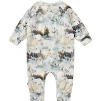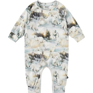 Light jersey romper in organic cotton with long sleeves and legs. Poppers on one shoulder and between the legs make putting on and taking off easy. Close-fitting design with ribbed cuffs at the sleeves and legs. All-over print of a group of polar bears frolicking in the snow.