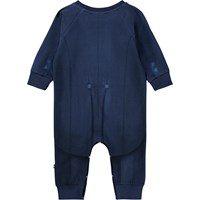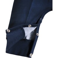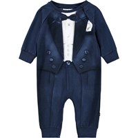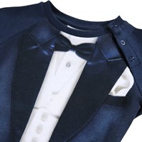 Blue baby romper made of soft organic cotton with a print of a suit. The baby romper has long sleeves and legs and snap buttons on one shoulder and between the legs to make it easy to take off and put on. It is loose and has ribbed edges on the sleeves and legs to make it comfortable to wear and providing plenty of space to move.