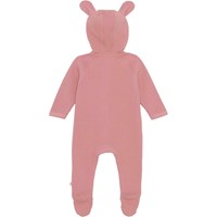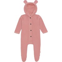Faith is a rose coloured, waffle knit baby romper with a snap closure on the front and a hood with small, sewn on ears. Please note that the romper has feet for sizes 56-74, while sizes 80-92 do not.