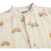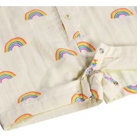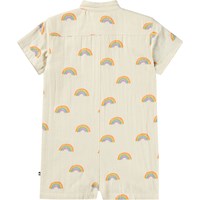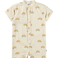 Cream-coloured romper for the little ones made of soft, organic cotton with a rainbow print. The romper has buttons at the front, short sleeves and legs, a small collar and a loose fit. There are snap buttons between the legs except in size 104.