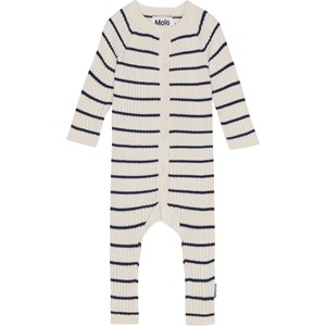White baby bodysuit in dark blue stripes with raglan sleeves. This bodysuit is in soft cotton/wool blend. It has a round neck, long sleeves and legs and has a button closure on the front.