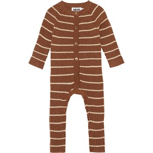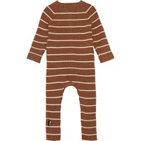 Farley is a brown knit baby romper with white stripes. It is in 80% cotton and 20% wool. The romper has long sleeves and legs and has a button front closure.