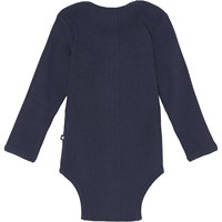 Faros is a blue, unisex baby bodysuit in rib. Faros has easy snap closure between the legs.