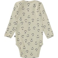 Faros is a grey baby bodysuit with a print of smiley faces. Wear it with matching trousers. Faros has easy snap closure between the legs.