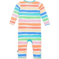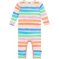 Multicolored jumpsuit with long sleeves and legs in organic cotton. The suit has snap buttons on one shoulder and between the legs, making it easy to put on and take off. The suit is form-fitting and has ribbed cuffs on the sleeves and legs. The suit features a multicolored striped print.