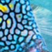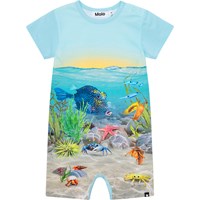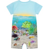 Short sleeve, blue romper in organic cotton. The romper has an easy snap closure at the neck and between the legs. It is in a loose, comfortable fit. The romper has a all around print of a sunset and a peak at the bottom of the ocean with colourful fish and plants.