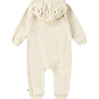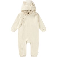 Off-white baby romper in organic cotton with a hood and cute teddy bear ears. The romper has long sleeves and legs, as well as a practical popper closure down the front, making it easy to put on and take off.