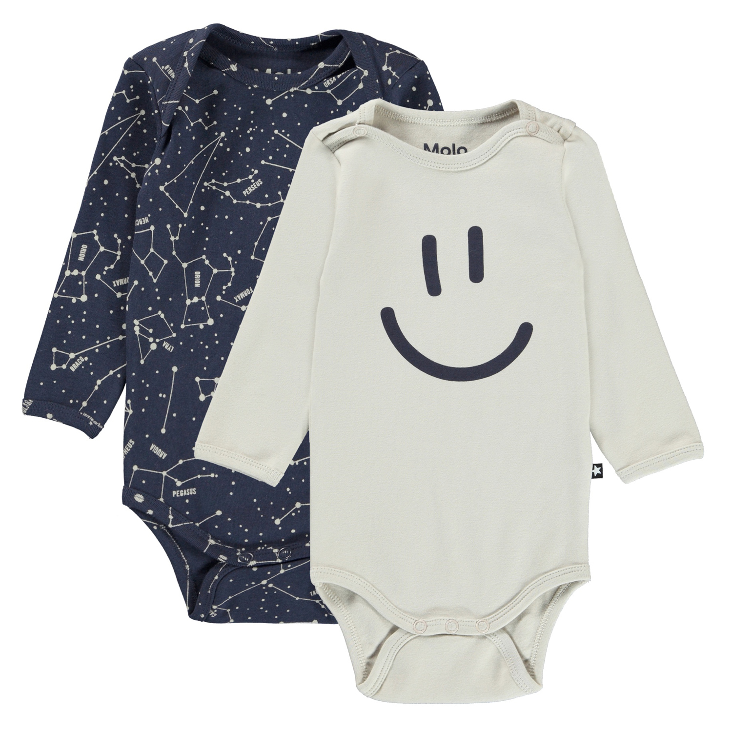 Foss is a long sleeve baby bodysuit. Foss comes in a 2-pack, which has one off white bodysuit and one blue with a print of a star map. It has easy snap closure at the neck and between the legs.