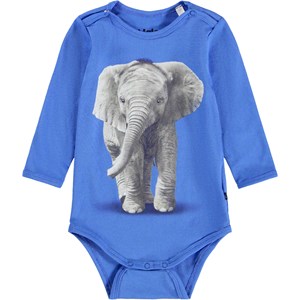Blue long-sleeved bodysuit for the little ones made of organic cotton with a print of a baby elephant. The bodysuit has binding tape and button closure on the shoulders and between the legs for easy dressing and undressing.