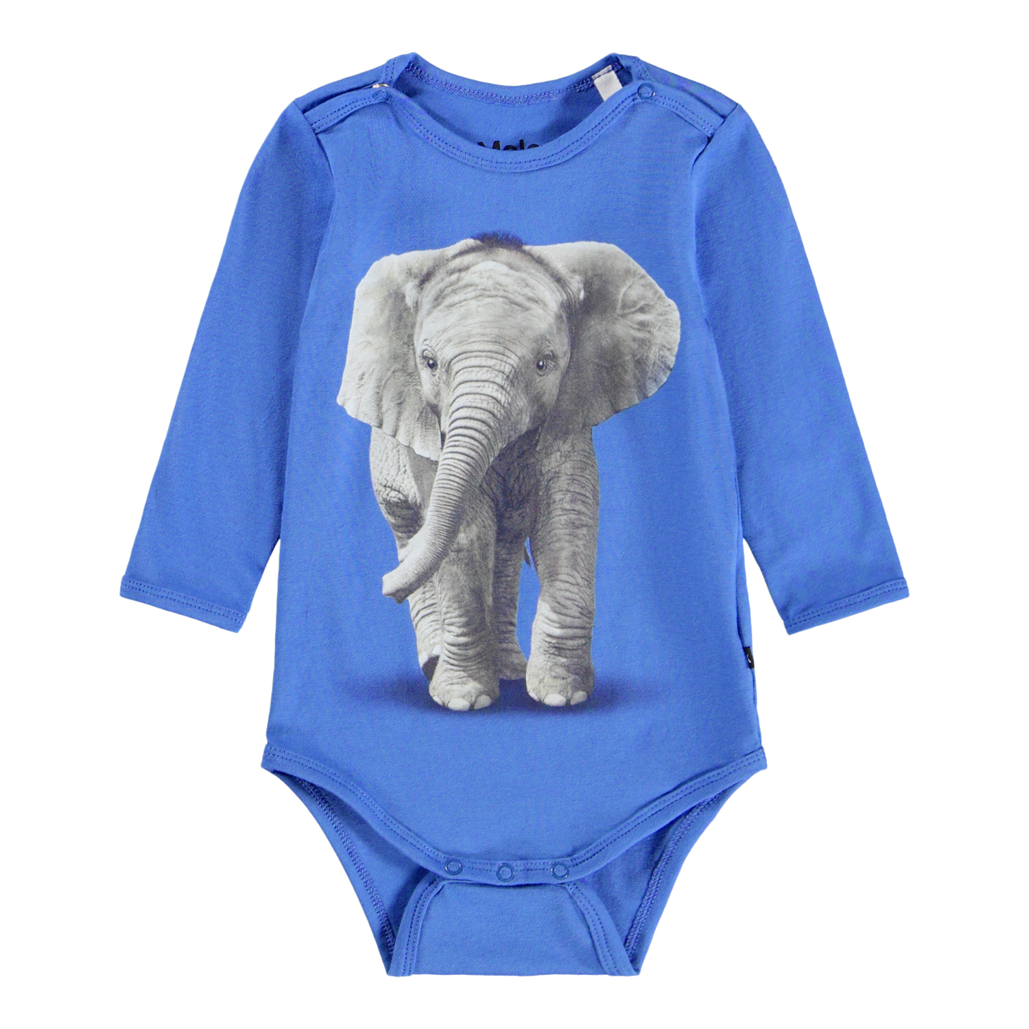 Blue long-sleeved bodysuit for the little ones made of organic cotton with a print of a baby elephant. The bodysuit has binding tape and button closure on the shoulders and between the legs for easy dressing and undressing.