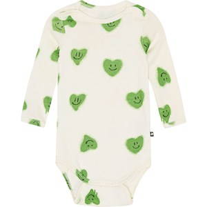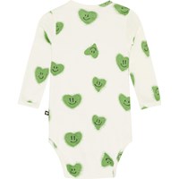 Long sleeve, light green baby bodysuit in organic cotton jersey. It has an easy snap closure at the neck and between the legs. The bodysuit is in an all over print of dark green hearts with smiling faces. You can wear it with baby trousers in the same print for a complete jersey set.