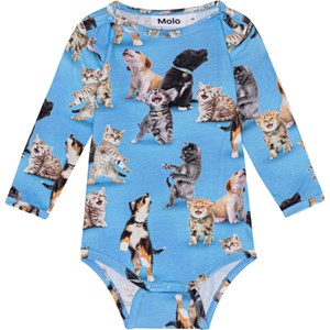 Long sleeve, blue baby bodysuit in organic cotton jersey. It has an easy snap closure at the neck and between the legs. The bodysuit is in an all over print of festive puppies and kittens. You can wear it with baby trousers in the same print for a complete jersey set.