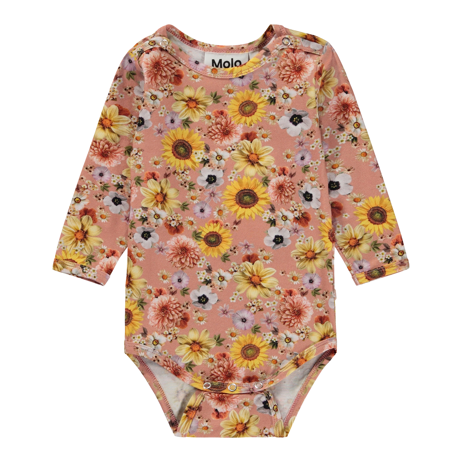Pink baby bodysuit in an all over floral print with sunflowers, Dahlias and daisies. This bodysuit is in 100% cotton, has long sleeves and an easy snap closure at the neck and between the legs. Wear it with the Stafanie trousers in the same print.