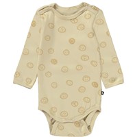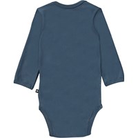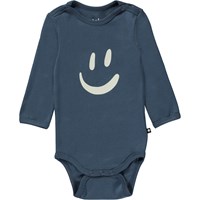Dark blue baby bodysuit with a front print that has a smiley face in light grey. This bodysuit is in 100% cotton, has long sleeves and an easy snap closure at the neck and between the legs. Wear it with the Seb trousers in the same print.