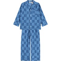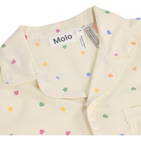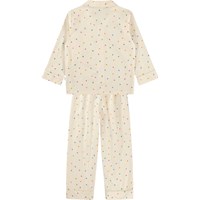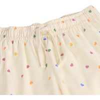 Beige two-piece pyjamas made of soft, organic cotton with long sleeves and legs. The shirt has a breast pocket, collar and buttons, and the shorts have elastic and a drawstring at the waist. The set has a colourful print of small hearts.