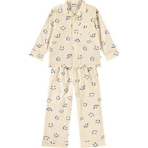 Off-white pyjama set with long sleeves and legs in organic cotton. The shirt has a loose fit, a button-down collar, a chest pocket, and rolled-up sleeves. The pants have a loose fit and have an elastic waistband with a drawstring. The set features an all-over print of smiling dark blue faces.