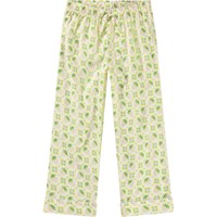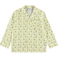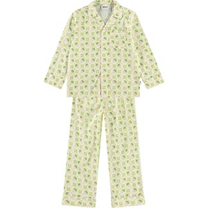 Off-white pyjama set with long sleeves and legs in organic cotton. The shirt has a loose fit, a button-down collar, a chest pocket, and cuffs on the sleeves. The pants have a loose fit and have elastic and a drawstring at the waist. The set features an all-over print of pink strawberries and white flowers, blending together in a beautiful pattern.