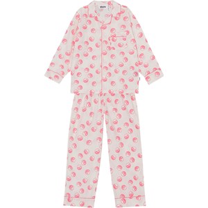 Off-white nightwear set in soft, organic cotton. The top has long sleeves with roll up at the cuffs. It has a chest pocket, a button closure and a lovely collar. The wide trousers have roll up at the legs and an elastic with a drawstring for a comfortable fit. The set is in an all over print of yin/yang symbols in off-white with an edge tape in the same colour for a refined finish.