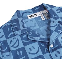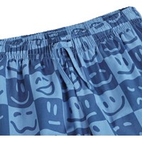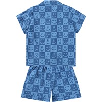 Blue check two-piece pyjamas made of soft, organic cotton with short sleeves and legs. The shirt has a collar and buttons, and the shorts have elastic and a drawstring at the waist. The set has a humorous print of faces with different expressions.
