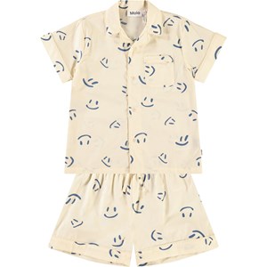 Off-white pyjama set with short sleeves and legs in organic cotton. The shirt has a loose fit, a collar with buttons down the front, a chest pocket, and rolled-up sleeves. The shorts have a loose fit, go to mid-thigh, and have elastic and a drawstring at the waist. The set features an all-over print of smiling dark blue faces.