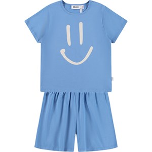 Blue pyjamas with short sleeves and legs made of stretchy, soft organic cotton. The set has two-piece and consists a loose t-shirt with a round neck and a pair of shorts with an elasticated waist, making them comfortable to wear. The set has a smiling white face on the front.