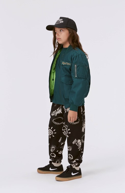 Black joggers in a beige all over print that has elements from various prints in the collection. Say hello to the dancing aliens, the shining sun, all the planets, a smile, beating hearts and peace signs. What a party! They are in 100% cotton, have an elastic waist with inner ties, elastic at the legs, side pockets and a back pocket. They are in a regular fit. Wear the joggers with the Monti jumper in the same print for a perfect set.