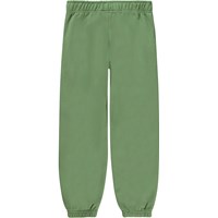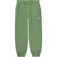 Adan is a pair of green unisex sweatpants with an embroidered peace sign on one pocket. They have elastic at the waist and legs.