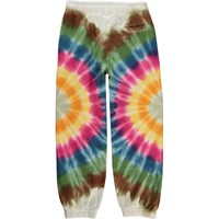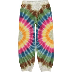 White joggers with a multi-colour, circle tie-dye print. These joggers are in 100% cotton. They have elastic and an inner tie at the waist as well as elastic at the legs and side and back pockets. The joggers are in a reguler fit.