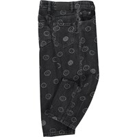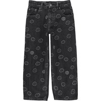 Black jeans with happy smiley faces. These jeans are in 100% cotton. They are in a loose fit and have happy faces woven into the fabric. The waistband can be adjusted by an inner elastic so the pants fit all children perfectly. Sizes 92-134 have an easy snap closure, while sizes 140-176 have a regular jeans button.